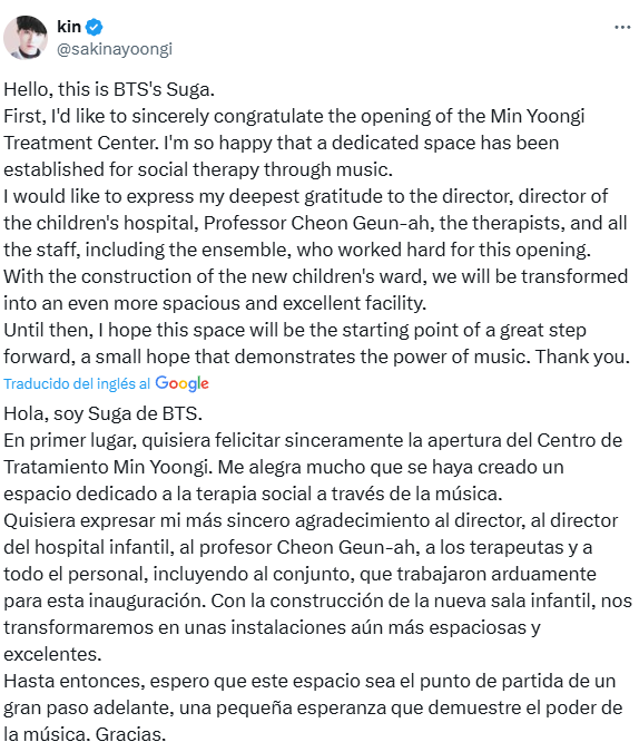 El Centro Min Yoongi, una nueva instalación del Hospital Severance dedicada a pacientes con trastorno del espectro autista, abrió sus puertas el martes. El centro se estableció gracias a una donación de 5 mil millones de wones (3,56 millones de dólares) de Suga, miembro de BTS, cuyo verdadero nombre es Min Yoon-gi.