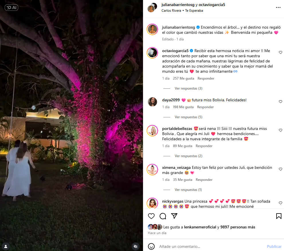 Por su parte, Octavio también expresó su felicidad con un conmovedor mensaje dedicado a Juliana, en el que resaltó su ilusión por ver nacer a su hija y acompañarla en cada etapa de su vida. “Me emociona saber que una mini tú será nuestra adoración cada mañana… Te amo infinitamente”, escribió el futuro papá, dejando ver la conexión y el cariño que los une.