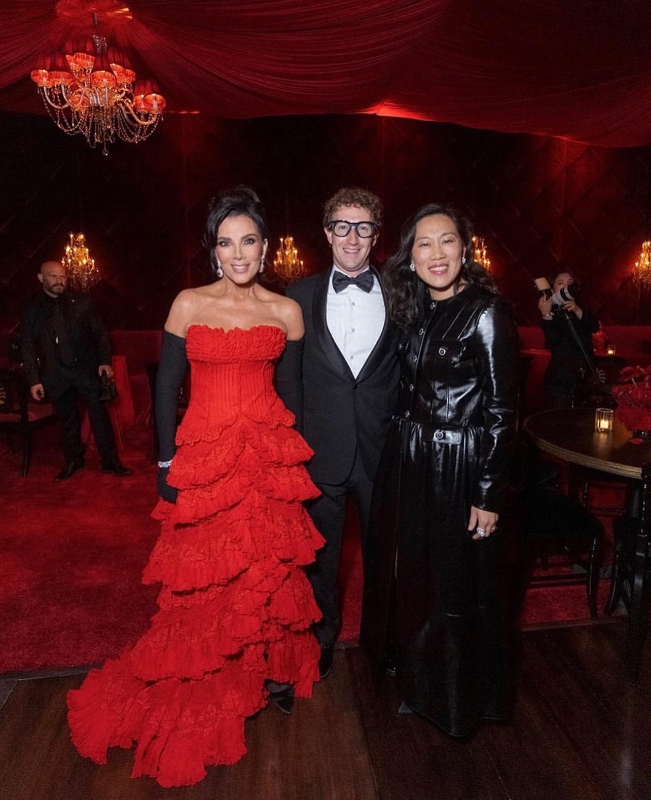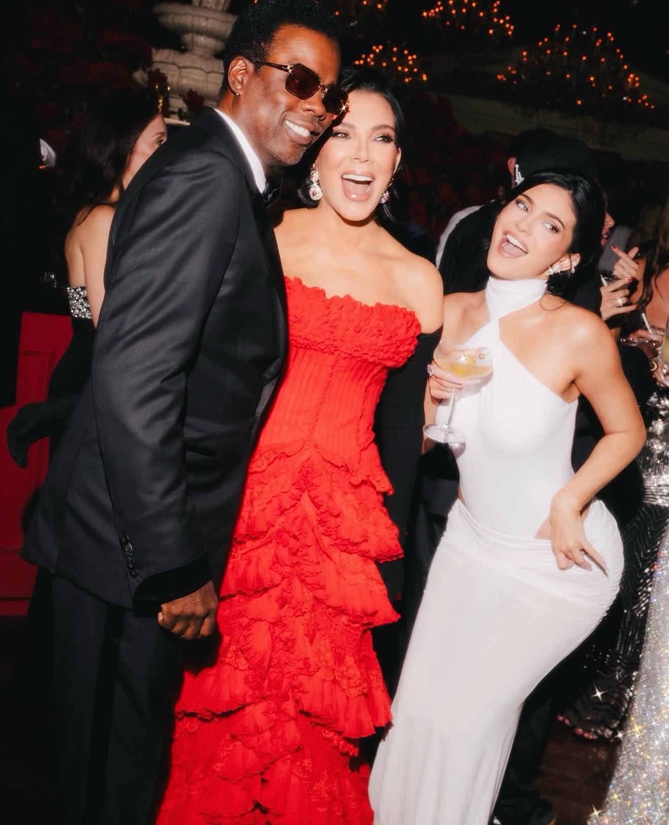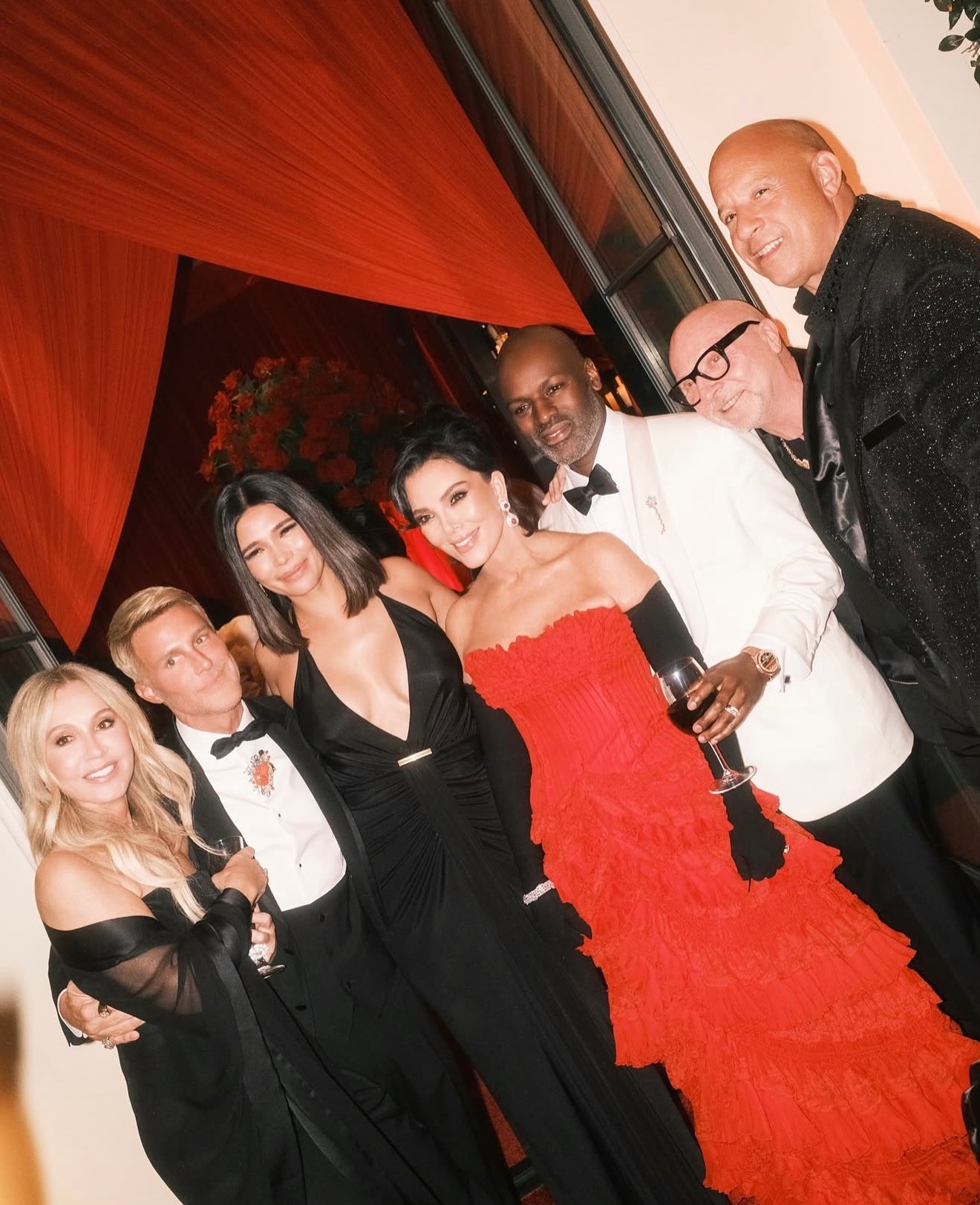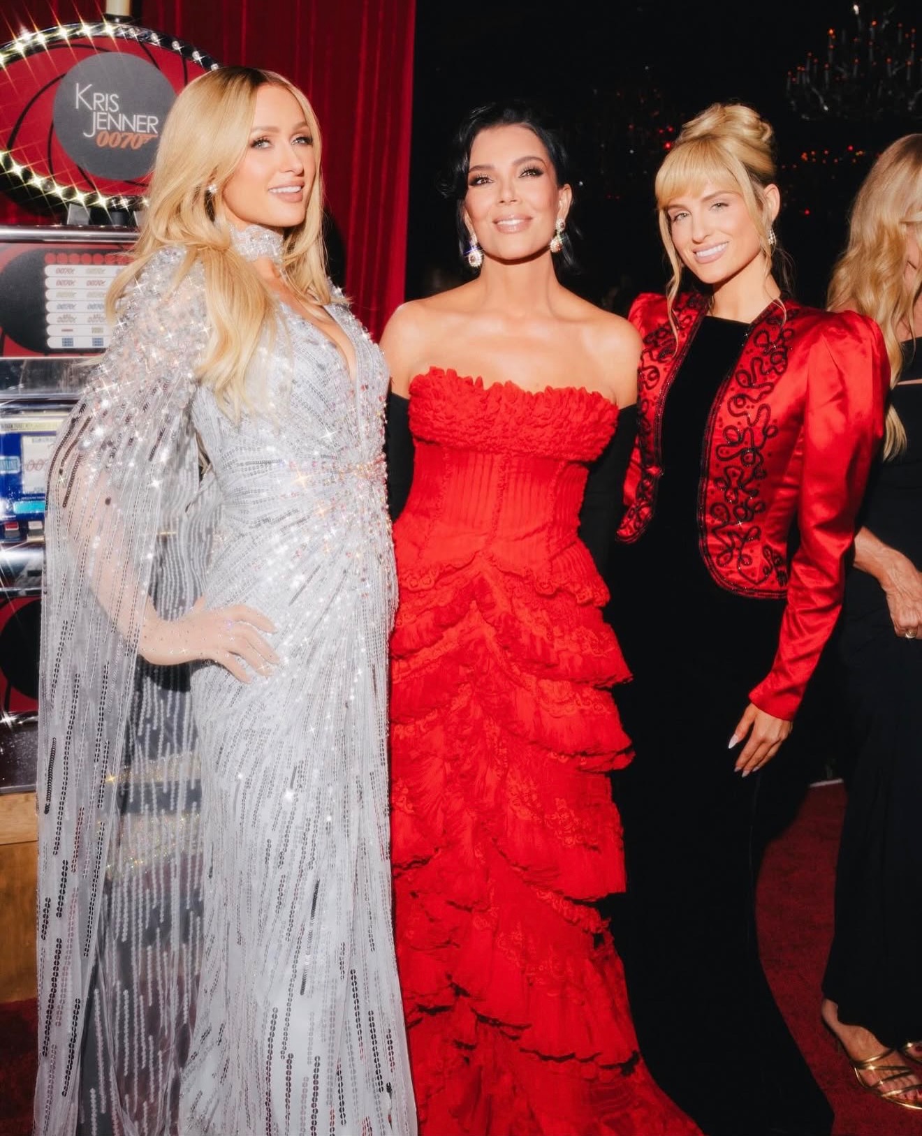 Kris Jenner deslumbró como protagonista de la noche con un vestido vintage de Givenchy Haute Couture, diseñado por Alexander McQueen en 2002, en un rojo intenso que simbolizaba poder y elegancia. La temática de la fiesta, inspirada en James Bond, reflejó su amor por el lujo y la sofisticación, haciendo de la velada un evento cinematográfico.