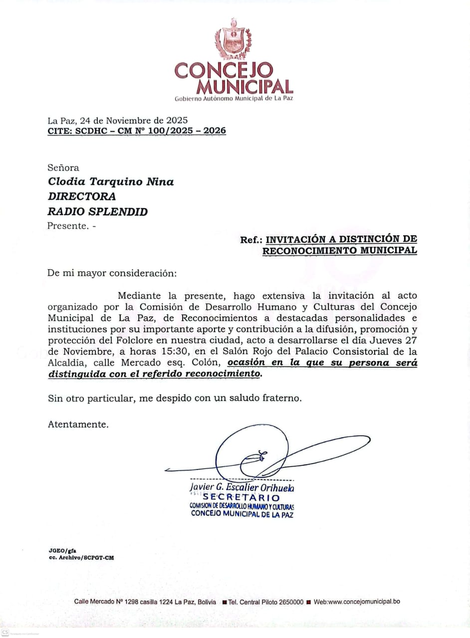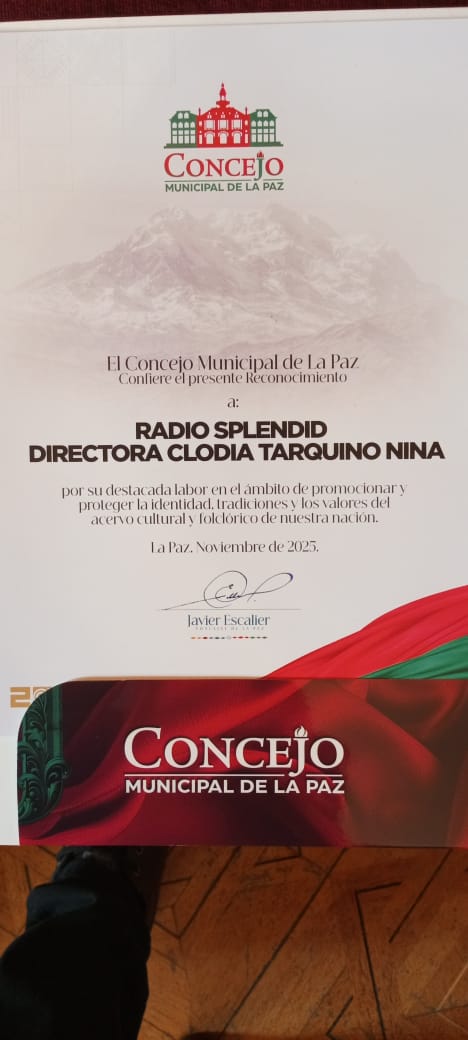 La tarde de este jueves, Radio Splendid recibió un importante reconocimiento por parte del Concejo Municipal de La Paz, por su destacada labor en el ámbito de promocionar y proteger la identidad, tradiciones y los valores del acervo cultural y folclórico de nuestra nación.